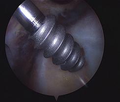 The picture on the top left shows, during shoulder arthroscopy surgery, a suture anchor being inserted into the bone of the head of the humerus, just next to the edge of the torn rotator cuff.
